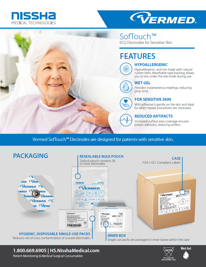 Vermed's SofTouch™ electrodes by Nissha Medical Technologies are designed for patients with sensitive skin needs. This specialty electrode is great for patients who have had reactions to your primary electrode or for elderly patients. It's large size and gentle materials make it the perfect option for sensitive skin patients in cardiac rehab.